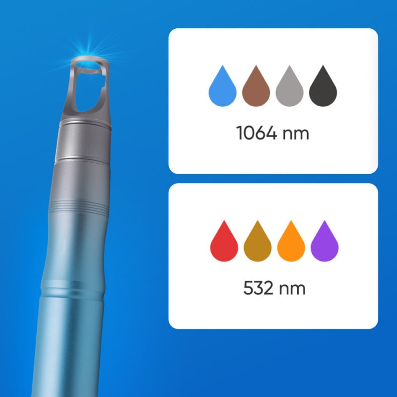 - 1064 nm: Această lungime de undă este eficientă pentru tratarea culorilor de cerneală mai adânci, cum ar fi negru și albastru, precum și probleme de pigmentare dermică.